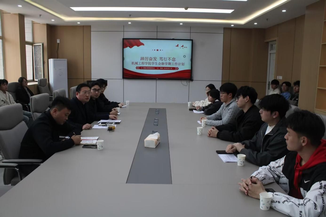 近日,机械工程学院学生会工作会议在学院会议室成功召开,学院党委副书记、副院长孙成政、团委书记薛浩、学生会主席团、各部门学生负责人参会。