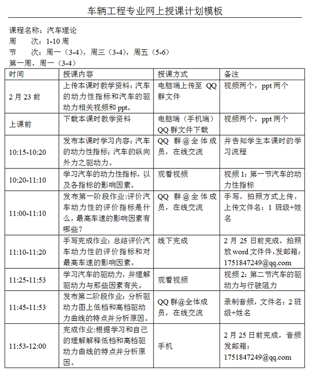 a)《汽车理论》网上授课计划