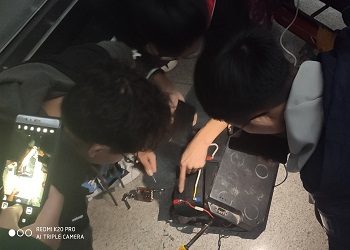 晚上义务修车服务队收到一位老师的在线求助,在得知对方电动车出现故障后,修车队队员们怀着服务他人、帮助他人的热情迅速出动,并在机械楼一楼大厅开展义务修车活动。修车队的队员们仍迅速出发,在询问电动车出现的故障并对其认真检查后,终于找到病因,电动车电源接线头由于安装师傅未焊实而脱落,导致电动车电瓶断电。由于电池顶壳被固定绳锁紧,对其拆装也变得极为困难。队员们认真讨论解决问题的方法,并确定了解决方案。经过耐心细致的修理后,终于将电动车电瓶接线头重新焊接到原位置,使电瓶正常供电。