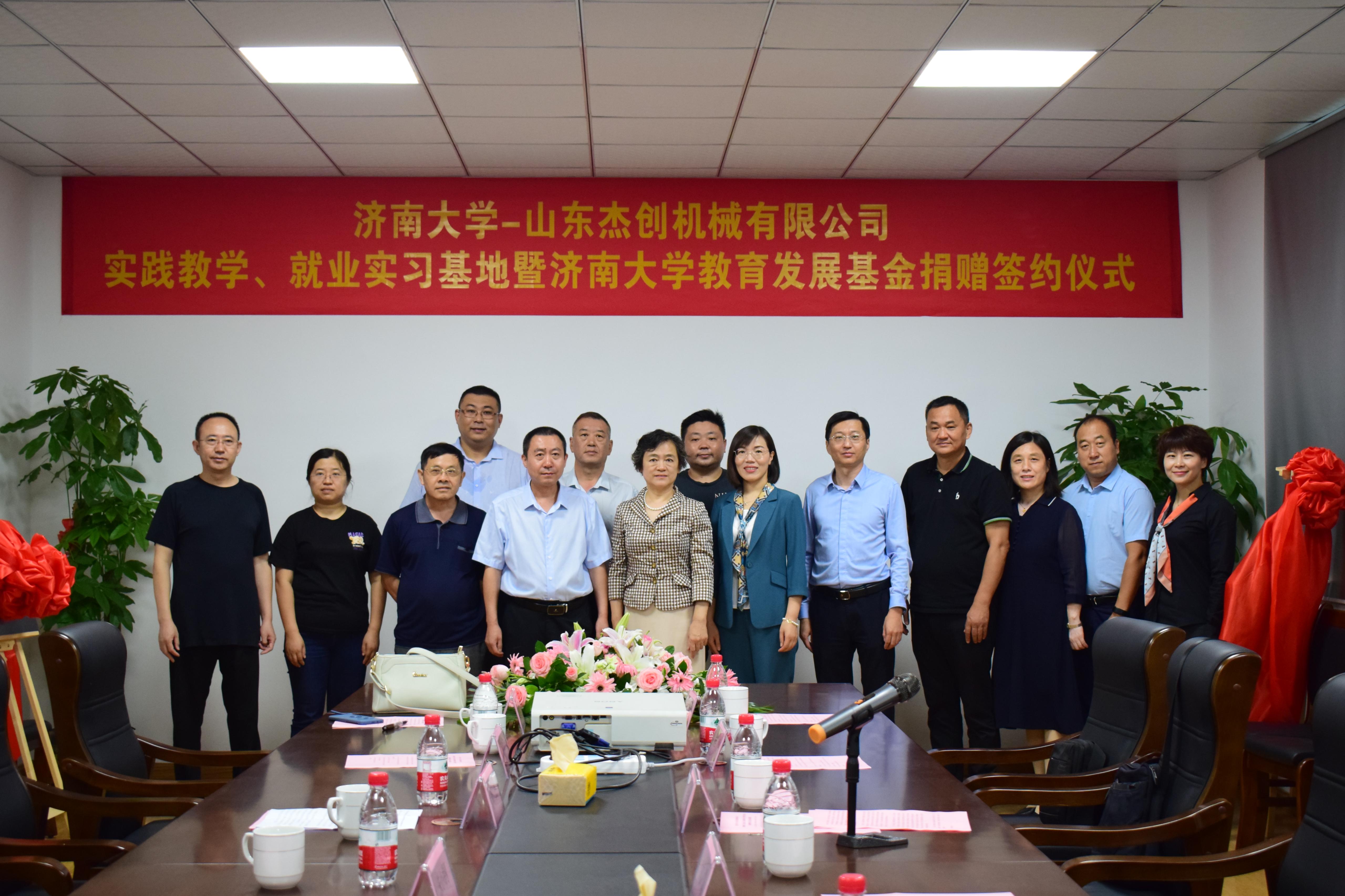 9月18日上午,“济南大学-山东杰创机械有限公司实践教学、就业实习基地暨济南大学教育发展基金捐赠”签约揭牌仪式在山东杰创机械有限公司会议室举行,济南大学党委副书记张硕秋,党委学生工作部(处)、合作发展处、机械工程学院相关负责人及师生参加活动。