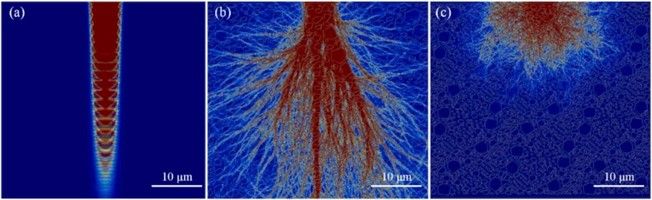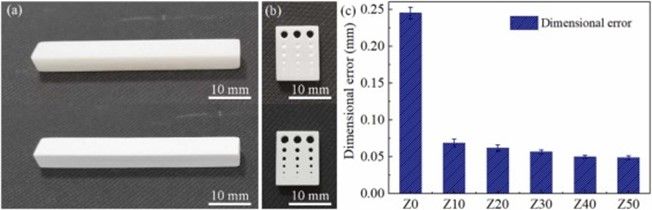 针对微晶玻璃半透性导致的3D打印精度低以及成形件强度低的难题,团队提出一种同时提高半透性微晶玻璃光固化增材制造成形精度和力学性能的方法,以扩大微晶玻璃在牙科、骨科和其他领域的应用。本研究将氧化锆粉末作为添加相加入氟磷灰石微晶玻璃粉末中,通过光固化3D打印成形微晶玻璃试样,并深入研究了氧化锆添加对成形精度、烧结收缩率、显微结构和力学性能的影响。通过光学数值模拟揭示了成形精度的改进机制,即低透光率的氧化锆加入高透光率的微晶玻璃浆料中可以改变浆料整体的光学性质,从而极大降低了光的散射范围,使成形尺寸误差减少了约80%。同时,断口分析表明氧化锆添加的主要强化和增韧机制包括载荷传递、拔出行为以及对裂纹固定、偏转、分支和桥接的影响,氧化锆增强微晶玻璃的弯曲强度和断裂韧性与原始微晶玻璃相比分别提高了2.5倍和2.1倍。